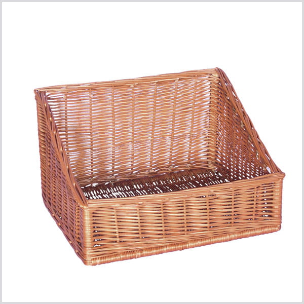 Mały kosz wiklinowy do ekspozycji świeżych produktów. Wykonany z pełnowartościowej wikliny w kolorze brązowym, idealny do ekspozycji pieczywa na stoiskach piekarniczych, wypieków w cukierni lub warzyw i owoców w sklepach spożywczych. Wyższy tył koszyka pozwala na umieszczenie produktów w koszyku według wielkości. Kosz pasuje do regałów metalowych ABM.