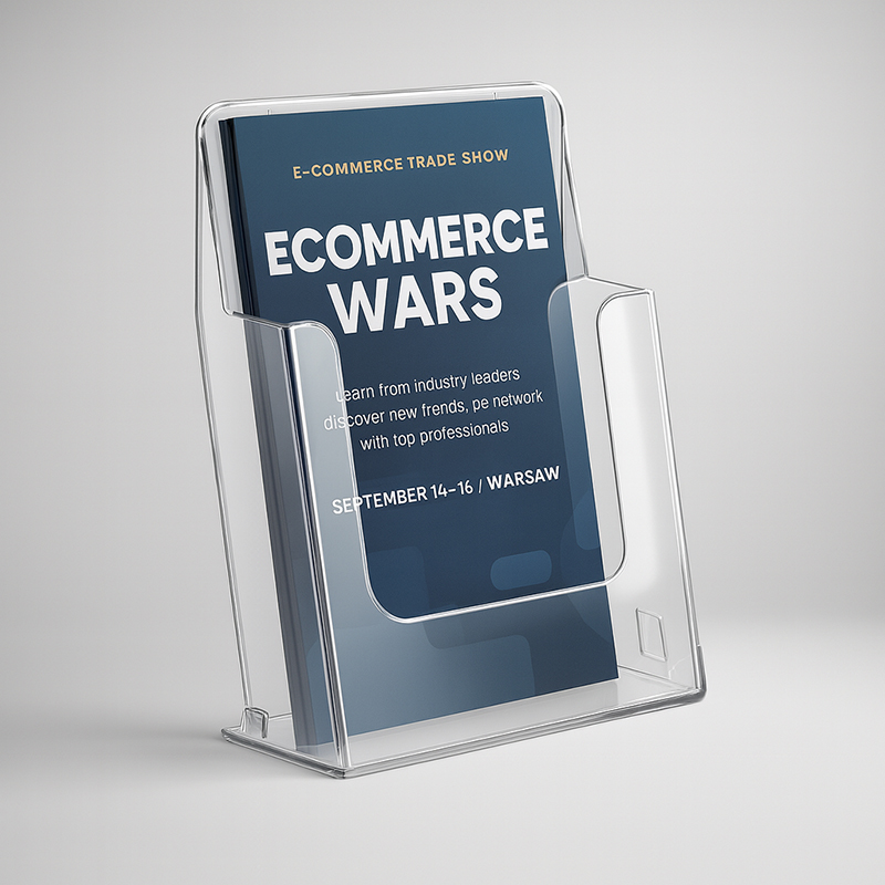 Przezroczysty stojak na ulotki A5 do ekspozycji broszur, katalogów i materiałów reklamowych w biurach, sklepach, hotelach